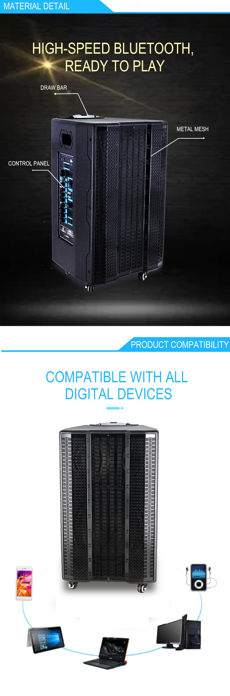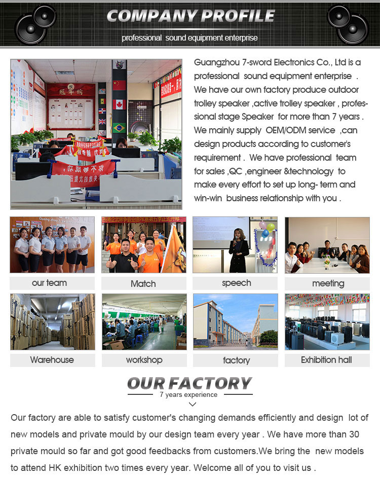 Guangzhou 7swords Electronic Co., Ltd está localizado en el distrito de Baiyun de la ciudad de Guangzhou, provincia de Guangdong. Somos una empresa privada y somos Famoso en la producción de oradores. Estamos especializados en el altavoz de la carretilla, el altavoz de Bluetooth portátil, el altavoz de DJ, la ECT.El año, diseñamos muchos modelos nuevos y un molde privado por nuestro equipo de diseño. Modelos. Modelos son buenos comentarios de nuestro nuevo y viejo. Clientes. Asistimos a HK Exhibition todos los años. Nuestro sitio web:7-electr.en.alibaba.com